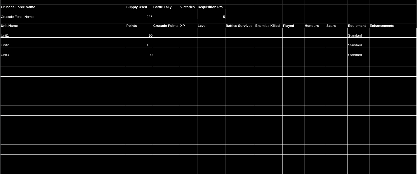 > I have created a spreadsheet to help digitise the "Order of Battle" and "Crusade Cards" into a condensed format. > The spreadsheet below has a tab for "order of battle" another tab for individual crusade cards that you can duplicate for your whole army or my preferred method is a tab that combines all of the above into one list (order of battle + crusade card)